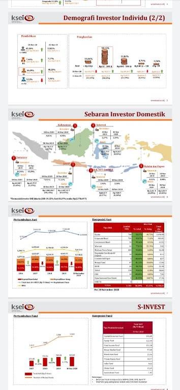 Dari sisi jumlah investor, dari akhir 2019 hingga 23 Desember 2020, jumlah Single Investor Identification (SID) tumbuh 45,51% menjadi 3.615.019 SID. Jumlah tersebut merupakan jumlah SID terkonsolidasi yang terdiri dari investor Saham, Surat Utang, Reksa Dana, Surat Berharga Negara (SBSN) dan Efek lain yang tercatat di KSEI, dengan komposisi 1.547.619 SID yang memiliki aset Saham, 2.905.718 SID memiliki aset Reksadana dan 452.635 SID memiliki aset Surat Berharga Negara.