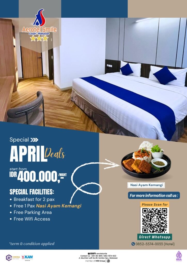 BISNISSULAWESI.COM, MAKASSAR – Aerotel Smile selalu aktif menghadirkan sesuatu yang istimewa bagi pengunjungnya setiap bulan. Termasuk untuk April ini, Aerotel Smile kembali menghadirkan paket promo “April Deals”, program istimewa yang menawarkan paket harga terjangkau mulai Rp400 ribu per malam.