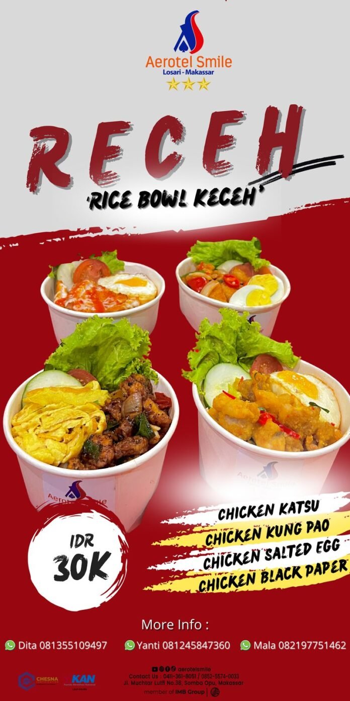 BISNISSULAWESI.COM, MAKASSAR – Aerotel Smile, hotel yang berada kawasan bisnis dan wisata Kota Makassar, meluncurkan paket Food & Beverage (F&B) “Rice Bowl Keceh”  (RECEH) yang dibanderol Rp30 ribu nett/bowl.