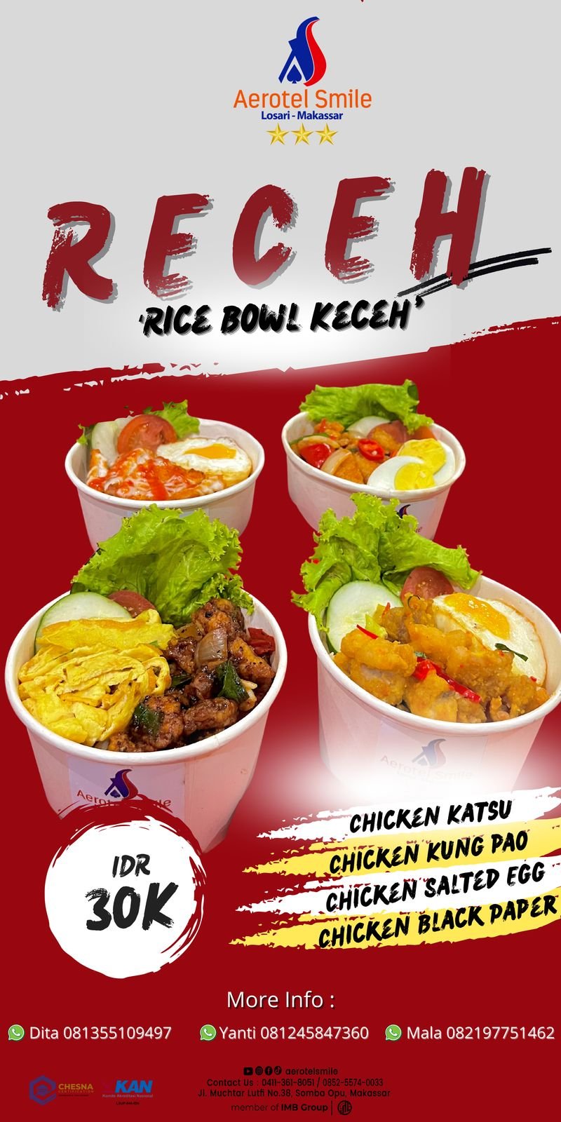 “Kami luncurkan “RECEH”, rasa yang menggungah selera dengan konsep makanan kekinian. Dapat di pesan langsung dengan menghubungi kontak hotel tersedia setiap hari. Dapat juga di pesan melalui kontak 0411- 3618051 @aerotelsmile,” ujar Dita.