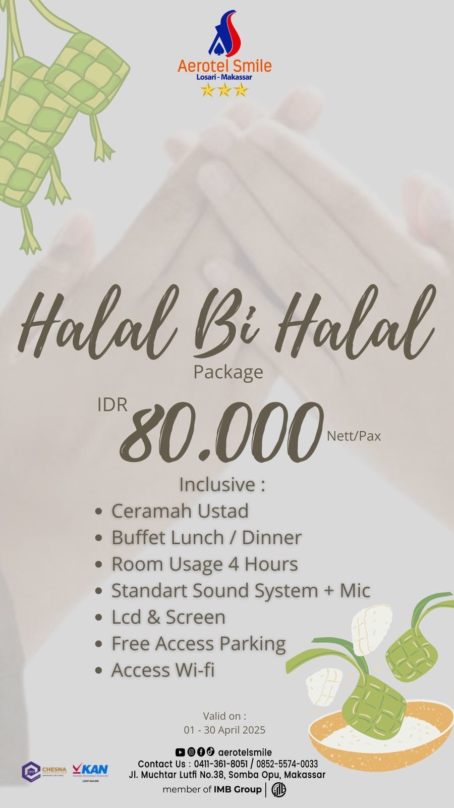 BISNISSULAWESI.COM, MAKASSAR – Aerotel Smile Losari Makassar meluncurkan Paket Halal Bi Halal yang di bandrol Rp80 ribu Nett/Pax. Berlaku 01 hingga 30 April 2025