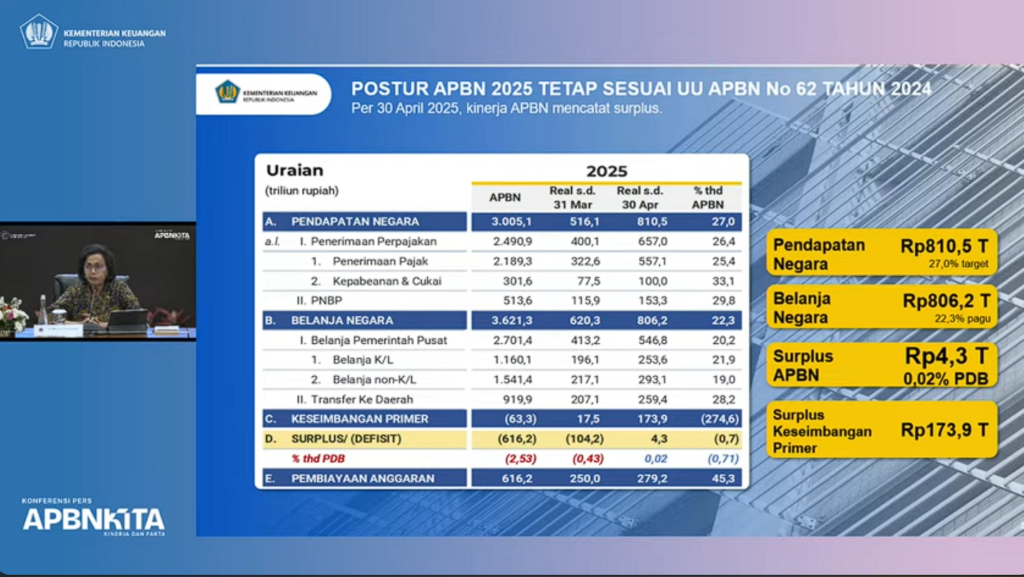 Menteri Keuangan RI, Sri Mulyani Indrawati menyebutkan, postur APBN hingga akhir April 2025, tercatat pendapatan negara Rp810,5 triliun atau sekitar 27 persen dari target. Kemudian, belanja negara Rp806,2 triliun (22,3 persen dari pagu).
