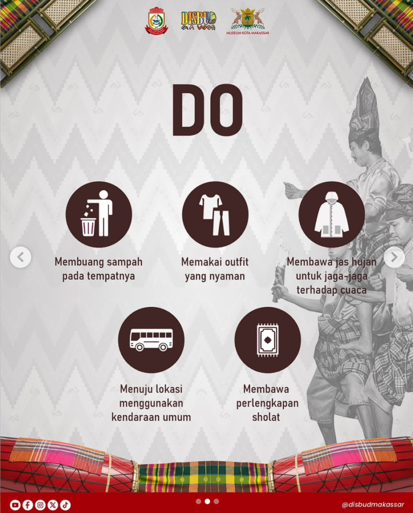 Untuk maksimal dan tertibnya seluruh rangkaian kegiatan, Dinas Kebudayaan Kota Makassar memberlakukan sejumlah ketentuan yang wajib dipatuhi pengunjung.