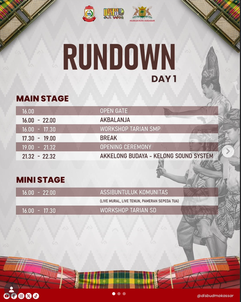 Berbagai rangkaian pertunjukan dan pameran seni budaya, bakal berlangsung tiga hari penuh, 10 – 12 April 2026. Dinas Kebudayaan Makassar menyiapkan sejumlah talenta pilihan untuk memeriahkan panggung budaya Makassar dengan semangat seni, kreativitas, dan keberagaman dalam satu perayaan yang istimewa, diantaranya Ilham Pamaru, Natinson, Kelong Sound System, dan Lentera Art Makassar.