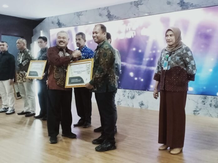 Kepala Kanwil DJPb Sulsel, Supendi menyerahkan penghargaan sebagai bentuk apresiasi kepada pemerintah daerah, serta dukungan mitra strategis dalam pengawalan program strategis pemerintah. POTO: BALI PUTRA