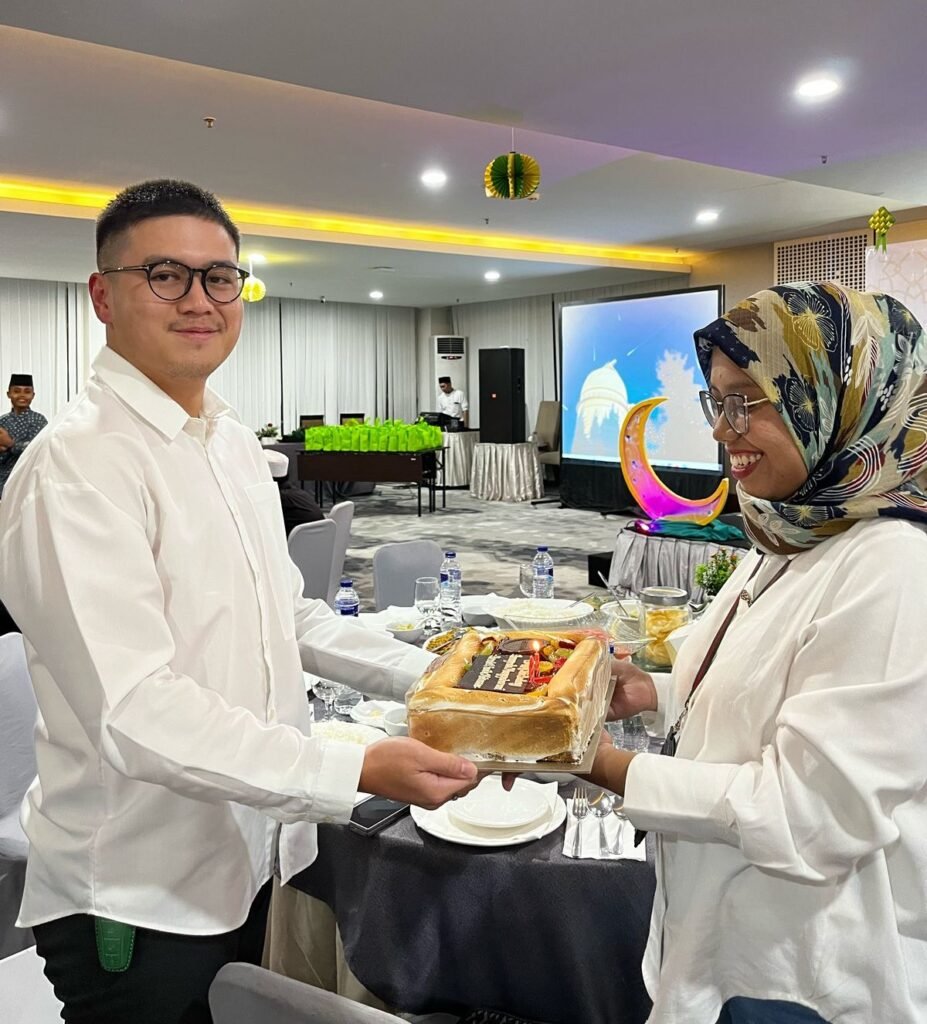 GM Aerotel Smile menyerahkan kue ulang tahun kepada Owner Aerotel Smile, Anugrah Manggabarani yang menjadi rangkaian acara buka puasa bersam keluarga besar Aerotel Smile, Senin (17/03/2025). POTO : ISTIMEWA