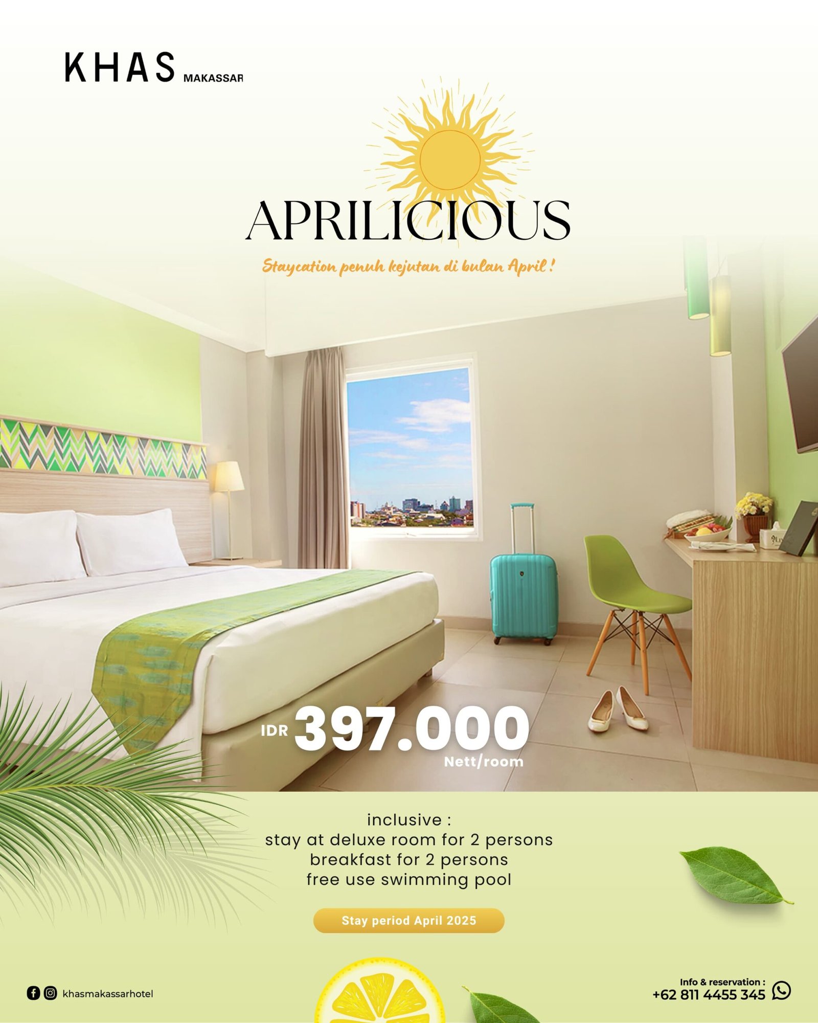 Di April ini, Hotel KHAS Makassar menawarkan berbagai promo menarik, diantaranya promo kamar “Aprilicious” dengan harga Rp397.000,-/nett/night. Di mana, tamu sudah dapat menginap di kamar deluxe termasuk breakfast untuk 2 orang dan bebas berenang di kolam renang. Promo ini berlaku selama April.
