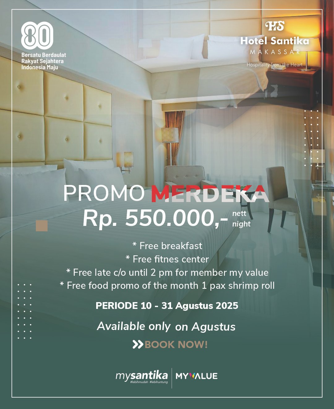 BISNISSULAWESI.COM, MAKASSAR – Hotel Santika Makassar menghadirkan “Promo Merdeka” dalam menyambut Hari Kemerdekaan RI. Promo Merdeka berlangsung bulan ini yang mencakup menginap satu malam di Deluxe room dengan harga Rp550.000.