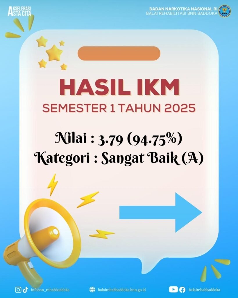 BISNISSULAWESI.COM, MAKASSAR – Balai Rehabilitasi Badan Narkotika Nasional (BNN) Baddoka, Makassar, sukses meraih predikat sangat baik dalam hal layanan terhadap masyarakat. Berdasarkan penilaian Indeks Kepuasan Masyarakat (IKM) semester I-2025, Balai Rehabilitasi BNN Baddoka memperoleh nilai 3,79 (94,75 persen) dengan kategori sangat baik (A).