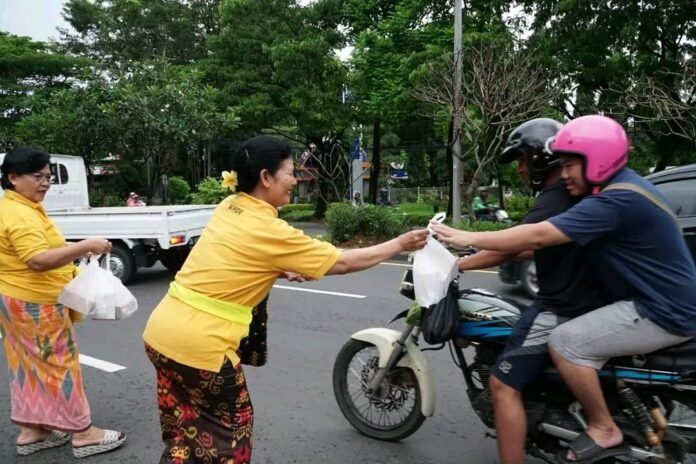 BISNISSULAWESI.COM, MAKASSAR – Umat Hindu Sulawesi Selatan (Sulsel), ikut berbagi takjil jelang berbuka puasa bagi umat Islam yang melintas di Depan Pura Giri Natha Makassar, Minggu (16/05/3025).