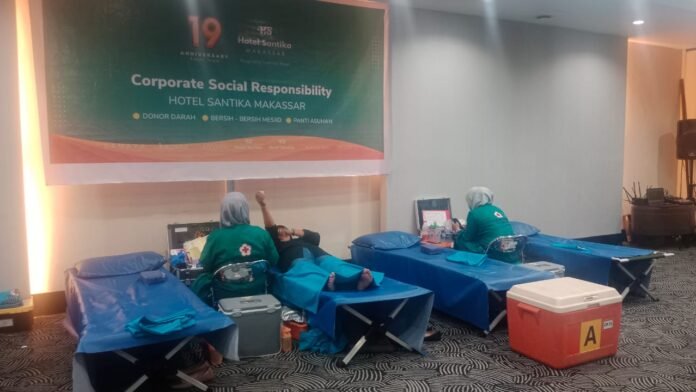 BISNISSULAWESI.COM, MAKASSAR – Hotel Santika (HS) menggelar berbagai kegiatan sosial sebagai bagian dari Corporate Social Responsibility (CSR) ata tanggungjawab sosial perusahaan, sebagai rangkaian anniversary ke-19 tahun. Diantaranya aksi donor darah, membersihkan masjid, membagikan Al-Quran untuk sejumlah Tahfidz dan lainnya.
