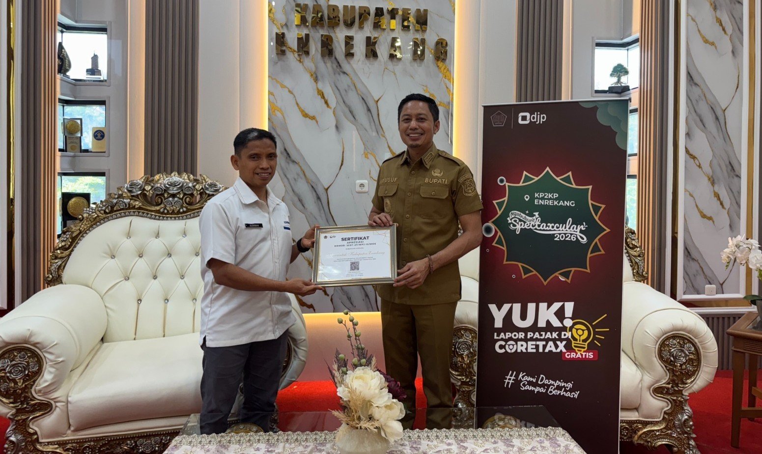 Sertifikat penghargaan diserahkan langsung Kepala KP2KP Enrekang, Sudirman, kepada Bupati Enrekang, Muh Yusuf Ritangnga. Penghargaan diberikan sebagai bentuk apresiasi atas sikap kooperatif Pemerintah Kabupaten Enrekang dalam menyediakan data regional yang dibutuhkan Direktorat Jenderal Pajak.