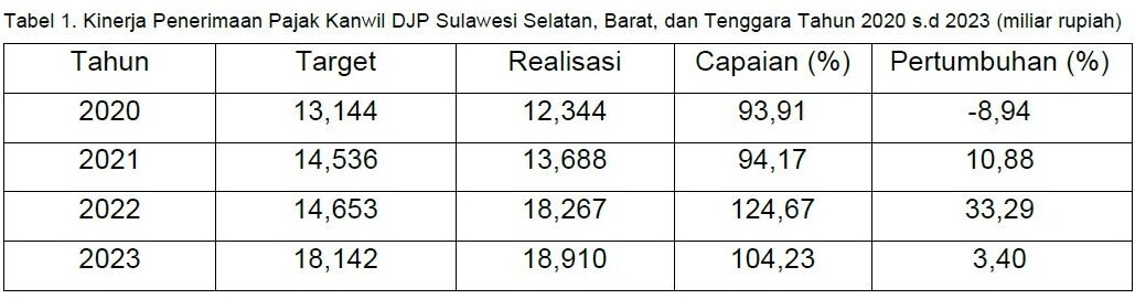 Penguatan intensifikasi serta pengawasan terencana dan terarah berbasis kewilayahan dan sektoral juga diyakini mampu menjadi daya dorong tercapainya optimalisasi penerimaan pajak di lingkungan Kanwil DJP Sulselbartra, sehingga terealisasi penerimaan pajak sebesar Rp18,910 triliun atau 104,23% dari target Rp18,142 triliun.