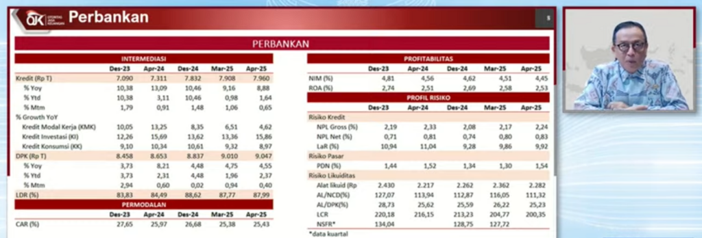 “Likuiditas industri perbankan tetap memadai, kualitas kredit terjaga dengan NPL gross 2,24 persen, NPL net 0,83 persen dan LDR 87,99,” ungkap Kepala Eksekutif Pengawas Perbankan Otoritas Jasa Keuangan (OJK), Dian Ediana Rae di Jakarta, Senin (02/06/2025).