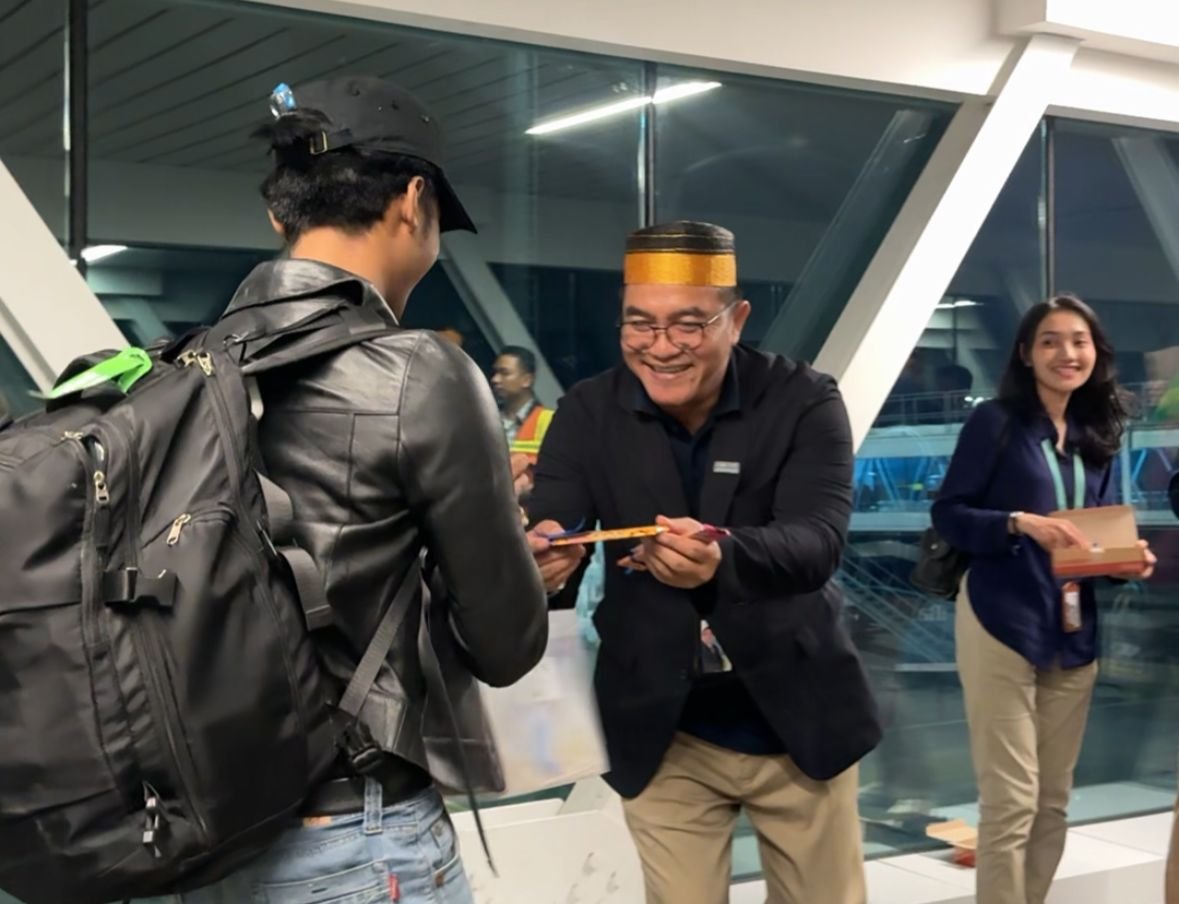 General Manager Bandara Internasional Sultan Hasanuddin, Minggus Gandeguai menyambut penumpang pertama yang tiba di Bandara Internasional Sultan Hasanuddin Makassar di Maros, Sulawesi Selatan tahun 2026. POTO: ISTIMEWA