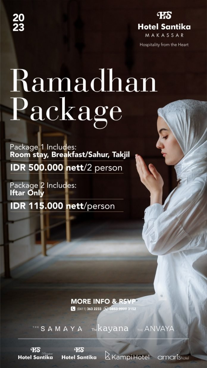 “hanya dengan Rp 500.000,-nett/malam sudah termasuk sarapan/sahur dan free takjil untuk 2 orang,” ungkap Sales Manager Hotel Santika Makassar, Rosa.