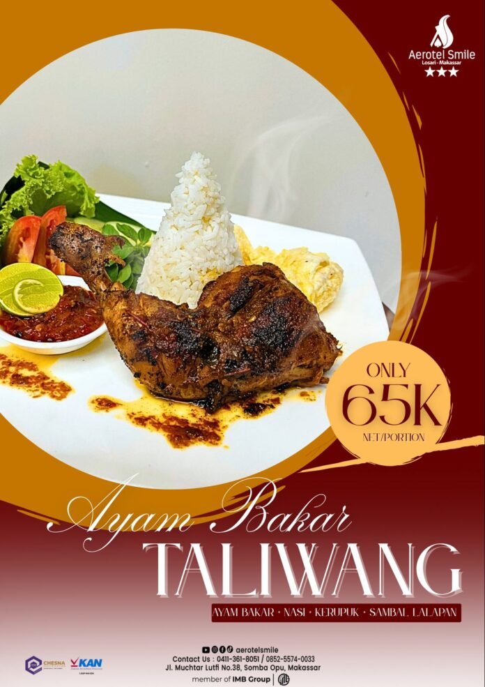 Aerotel Smile juga menyiapkan Promo Food & Beverage, menghadirkan sajian ayam bakar Taliwang, dengan bumbu khas Taliwang, Sumbawa, Nusa Tenggara Barat. Dibanderol Rp65 Ribu per porsi, dan dapat dipesan setiap saat di bulan Mei.