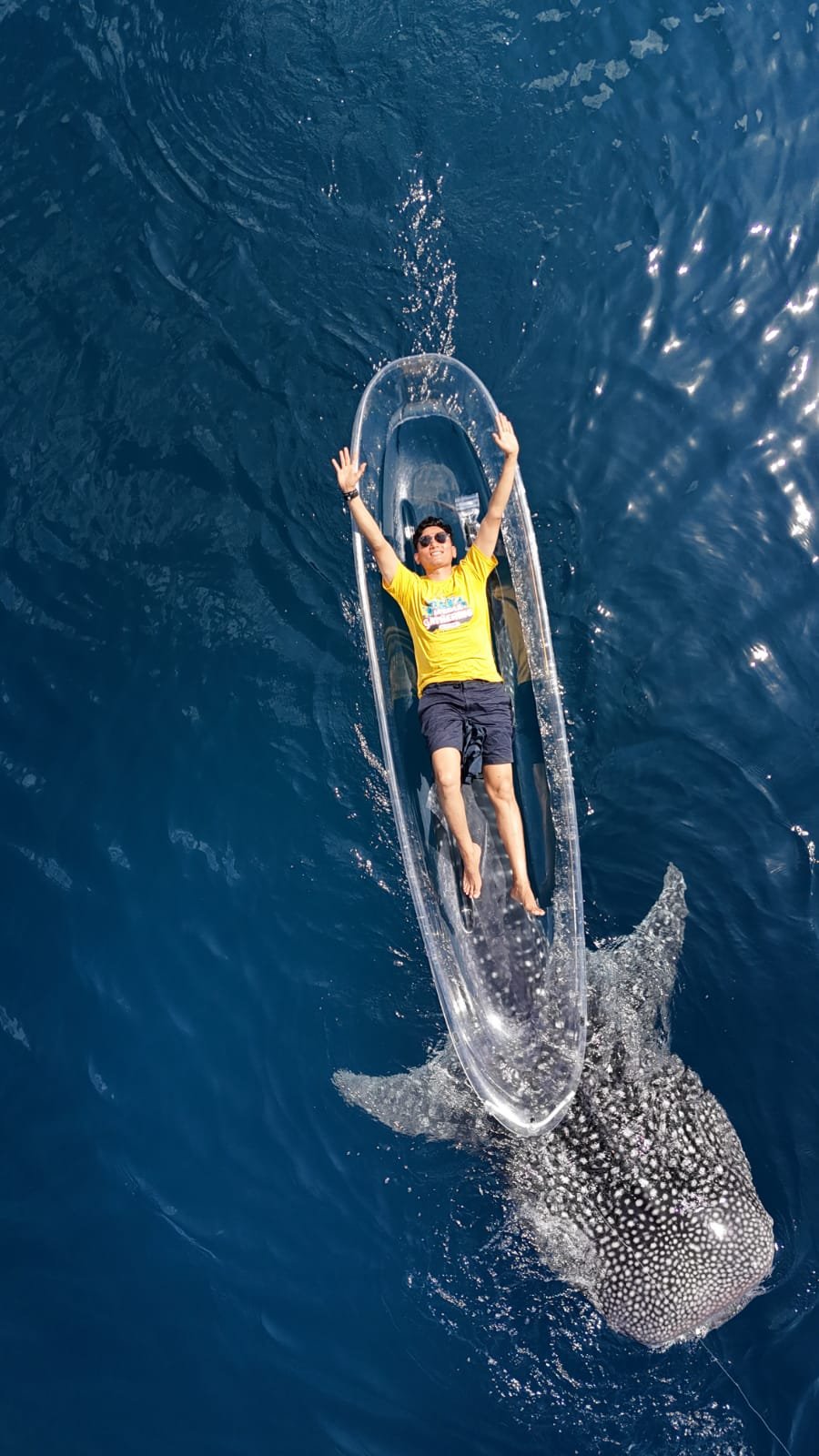 Iya, kekhawatiran itu wajra, karena tepat di bawah kano bening itu, terlihat jelas hiu paus berukuran besar dengan panjang sekitar 6–7 meter berenang pelan mengikuti gerakan perahu.