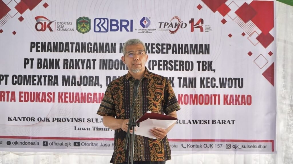 BISNISSULAWESI.COM, LUWU TIMUR – Kantor Otoritas Jasa Keuangan Provinsi Sulawesi Selatan dan Sulawesi Barat (OJK Sulselbar) menandatanganan nota kesepahaman sekaligus edukasi keuangan kepada petani komoditas kakao di Kabupaten Luwu Timur.