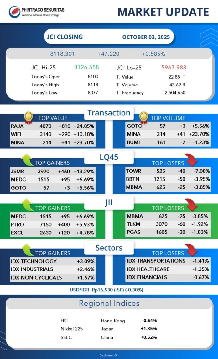 IHSG ditutup menguat pada level 8,118.30 (+0.59 persen) di perdagangan, Jumat (03/10/2025). Saham sektor teknologi memimpin penguatan indeks, sedangkan saham sektor transportasi mengalami koreksi terbesar.