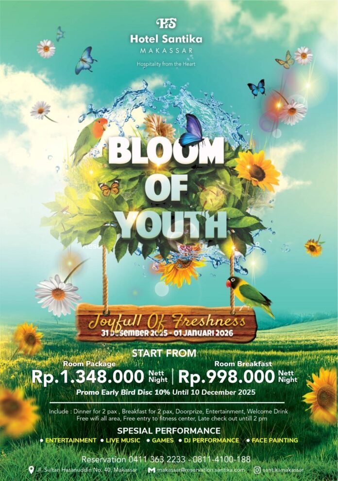 BISNISSULAWESI.COM, MAKASSAR – Perayaan tahun baru di di Hotel Santika Makassar dipastikan memukau. Mengusung konsep “Bloom Of Youth”, acara eksklusif ini menjanjikan pengalaman tak terlupakan, memadukan pesona bunga dengan pemandangan dekorasi yang memukau.