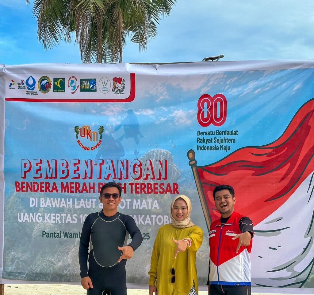 BISNISSULAWESI.COM, WAKATOBI – Memperingati 80 tahun kemerdekaan Republik Indonesia, momen bersejarah tercipta di bawah laut Wakatobi. Bendera Merah Putih terbesar dibentangkan di salah satu spot penyelaman paling ikonik Indonesia, yaitu “Spot Mata Uang Rp10.000” di Pantai Wamboliga, Wakatobi, Sulawesi Tenggara.