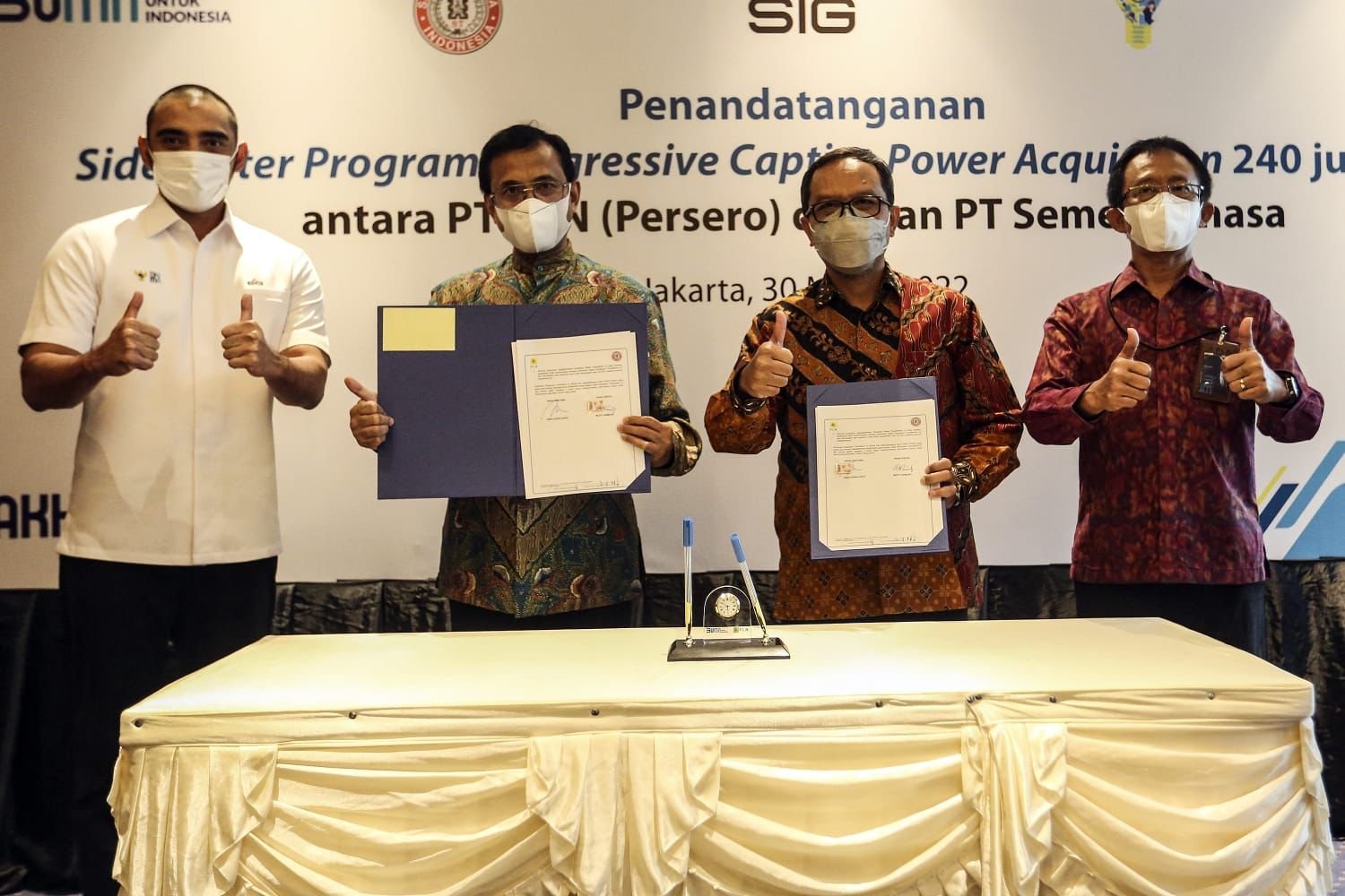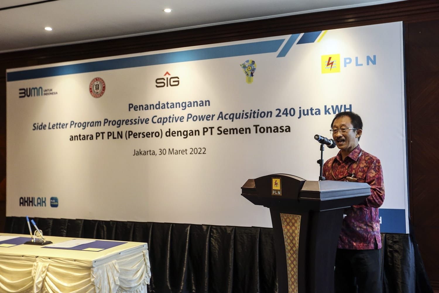 Penandatanganan Side Letter Program Progressive Captive Power Acquisition, PT Semen Tonasa Tahun Kedua Periode 1 April 2022 – 31 Maret 2023, dilakukan oleh General Manager PLN Unit Induk Wilayah (UIW) Sulawesi Selatan, Sulawesi Tenggara, dan Sulawesi Barat (Sulselarbar), Awaluddin Hafid; bersama Direktur Utama Semen Tonasa, Mufti Arimurti.