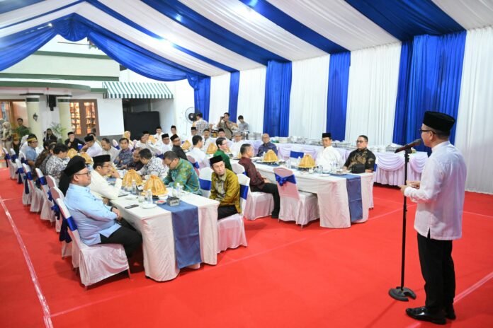 Sekda Jufri Rahman saat memberi sambutan pada buka puasa bersama yang digelar BI Sulsel menghadirkan mitra kerja di House of Rewako, Jalan Pasar Ikan, Makassar, Selasa (18/03/2025). POTO : ISTIMEWA