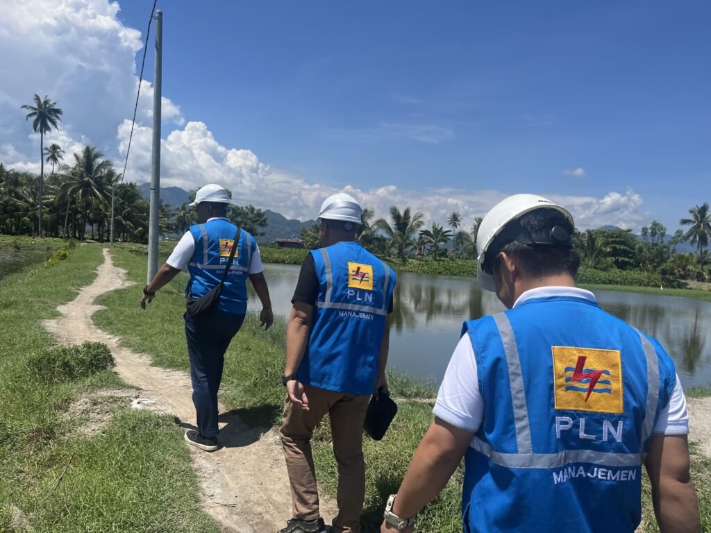 Petugas PLN melakukan peninjauan lapangan pasokan listrik tambak udang vaname di Desa Beru-beru, Kabupaten Mamuju. POTO : ISTIMEWA