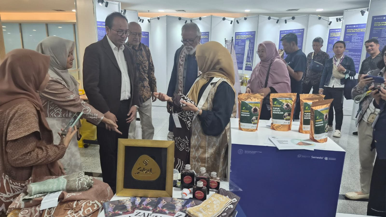 Dalam pameran itu, booth Zapa Emas dari Sulsel mendapat kunjungan Mendiktisaintek, Brian Yuliarto, yang kemudian tertarik dengan kain bermotif aksara Lontara dengan warna gelap, yang terpajang di booth itu.