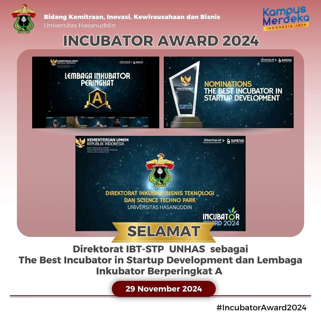 BISNISSULAWESI.COM, MAKASSAR – Universitas Hasanuddin (Unhas), melalui Direktorat Inkubator Bisnis dan Teknologi- Science Techno Park (IBT-STP) di bawah Wakil Rektor Bidang Kemitraan, Inovasi, Bisnis dan Kewirausahaan, berhasil menyabet 2 penghargaan bergengsi sekaligus dalam bidang enterpreneruship. Sebagai inkubator terbaik 2024 dan sebagai lembaga Inkubator Berperingkat A (tertinggi) di Indonesia. Penghargaan diberikan Kementerian UMKM RI di Jakarta, Jumat (29/11/2024).