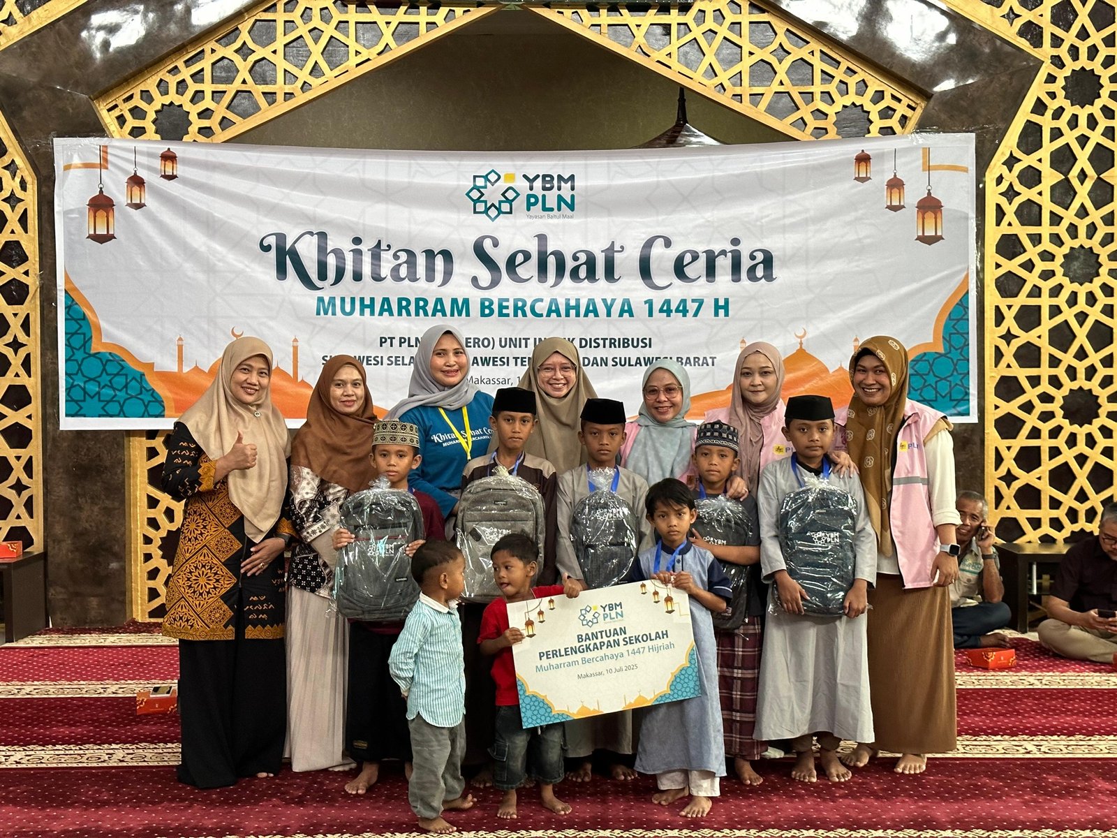 Ketua PIKK PLN UID Sulselrabar, Yuli Wardiana (keempat dari kiri) berserta jajaran dan Ketua Srikandi PLN UID Sulselrabar, Yuli Ashaniais Ramadani (ketiga dari kanan) beserta jajaran, saat penyerahan bingkisan peralatan sekolah secara simbolis kepada peserta Khitan Sehat Ceria, Kamis (10/07/2025). POTO : ISTIMEWA