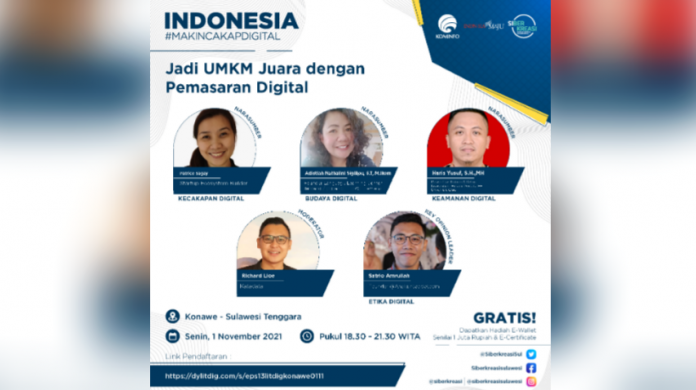 BISNISSULAWESI.COM, KONAWE – Sebanyak 821 peserta mendaftarkan dirinya untuk mengikuti Rangkaian Program Literasi Digital “Indonesia Makin Cakap Digital” di Sulawesi, yang diselenggarakan oleh Kementerian Komunikasi dan Informatika Republik Indonesia dan Siberkreasi bersama Dyandra Promosindo, yang dilaksanakan secara virtual pada 1 November 2021 di Konawe, Sulawesi Tenggara.