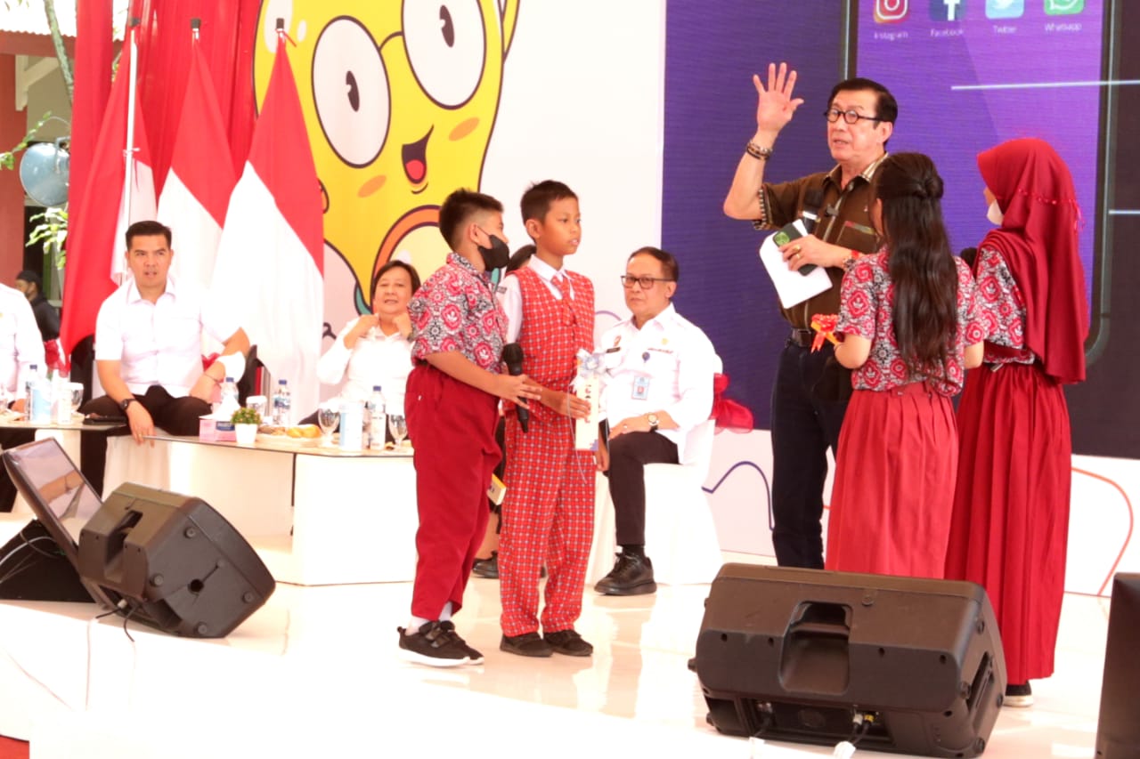 Menteri Hukum dan Hak Asasi Manusia (Menkumham) RI, Yassona H Laoly didampingi Wali Kota Makassar Moh Ramdhan ‘Danny’ Pomanto menyapa perwakilan pelajar SD dan SMP se-Kota Makassar.
