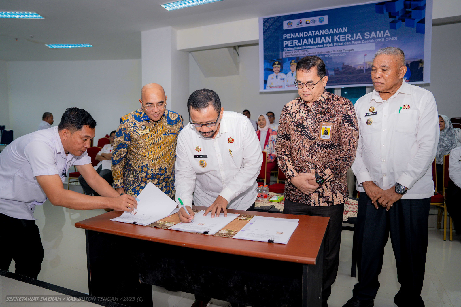 Kepala Kanwil DJP Sulselbartra, YFR. Hermiyana (kenakapn Bat8ik, red), hadir langsung di Kabupaten Buton Tengah menyaksikan penandatangan PKS OP4D, Rabu (15/10/2025). POTO : ISTIMEWA