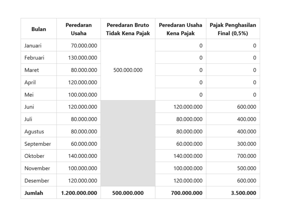 Berdasarkan PP 55/2022 dan PMK 164/2023, karena peredaran usaha Adi pada bulan Januari sampai dengan Mei tidak melebihi Rp.500.000.000,00 pada masa pajak tersebut Adi tidak dikenakan PPh Final. Mulai bulan Juni sampai dengan Desember, peredaran bruto telah melebihi Rp500.000.000,00 sehingga tiap masa pajak Adi wajib menyetor PPh Final terutang.