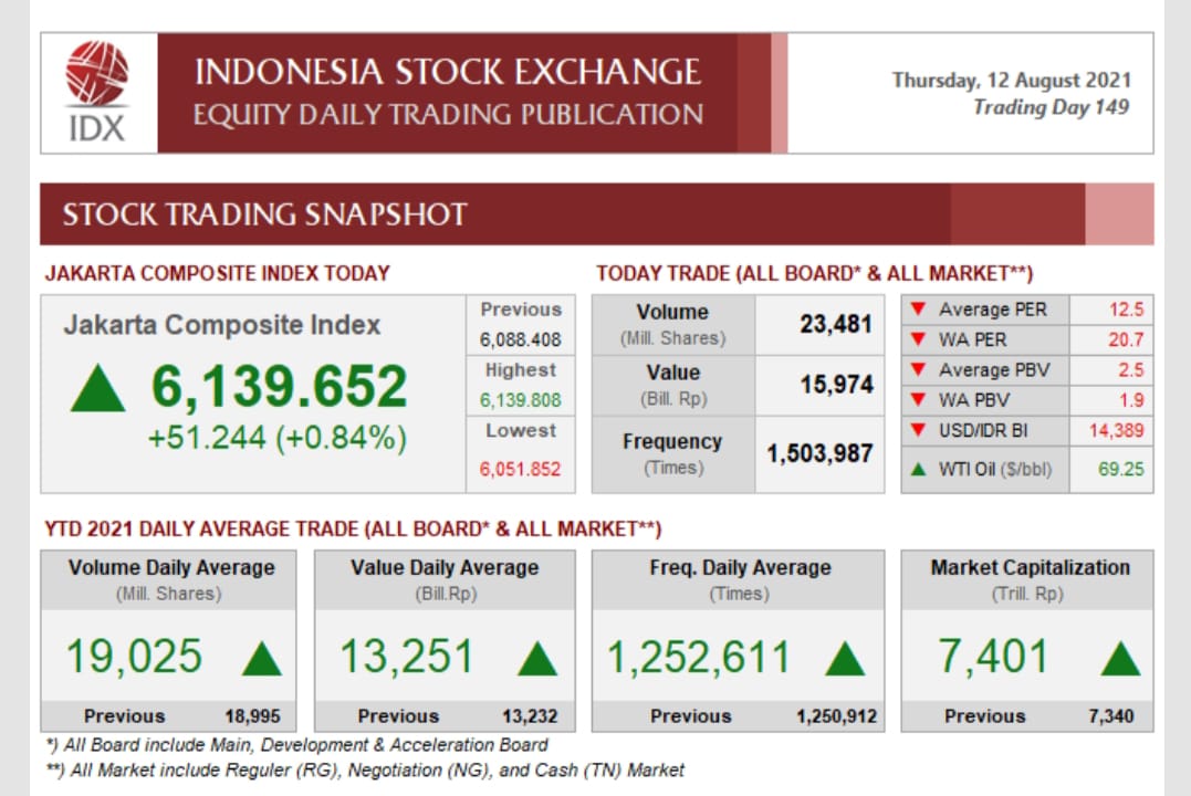 BISNISSULAWESI.COM, MAKASSAR – Mampu bertahan di zona hijau, IHSG ditutup menguat ke level 6139.652 (+0.842%) pada perdagangan Kamis (12/8). Selain IHSG, ASX 200 juga berada di zona hijau dengan penguatan sebesar 0.05%. Sementara itu, mayoritas bursa regional justru tercatat melemah. Diantaranya HSI (-0.53%), KOSPI (-0.38%), SSEC (-0.22%) dan Nikkei (-0.20%).