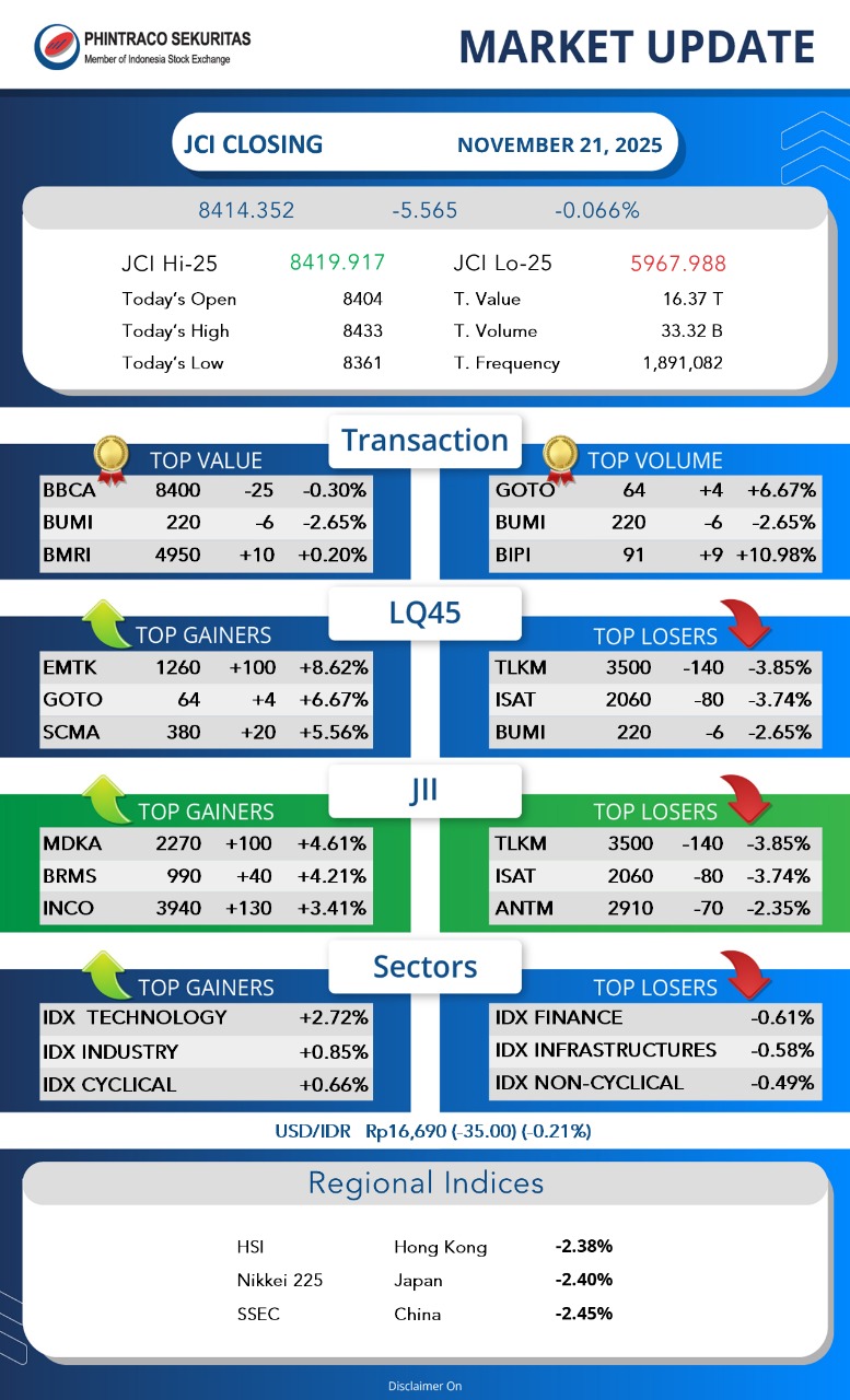 INDEKS Harga Saham Gabungan (IHSG) ditutup melemah pada level 8.414,35 (-0,07 persen) di perdagangan, Jumat (21/11/2025).