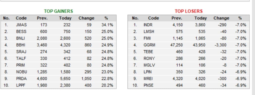 10 top gainers pada perdagangan hari ini JMAS, BESS, BNLI, BBHI, SRAJ, TALF, PRIM, NOBU, PRDA dan LPPF. Sedangkan 10 top losers yakni INDR, LMSH, FMII, GGRM, TEBE, RONY, MGLV, LPIN, MREI dan PNSE.