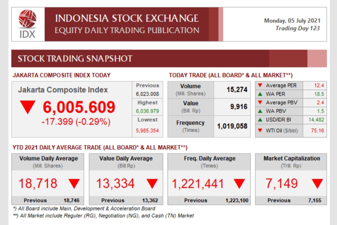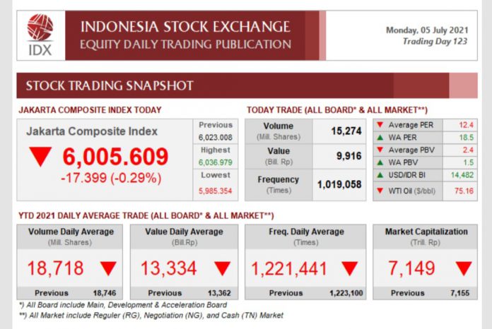 BISNISSULAWESI.COM, MAKASSAR – Indeks Harga Saham Gabungan (IHSG) pada Bursa Efek Indonesia (BEI) mengalami koreksi pada penutupan perdagangan di awal pekan ini, Senin (05/07/2021) sebesar 0.29% (17.399 poin) yaitu pada posisi 6,005.609 poin dibandingkan dengan penutupan perdagangan Jumat pekan lalu yang berada di level 6,023.008 poin.