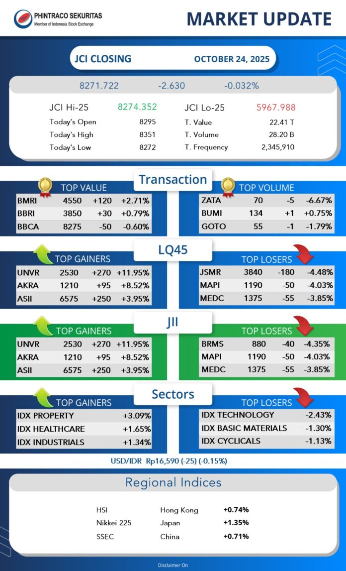 BISNISSULAWESI.COM, MAKASSAR – Indeks Harga Saham Gabungan (IHSG) ditutup flat pada level 8.271,722 (-0.03 persen) di perdagangan, Jumat (24/10/2025).