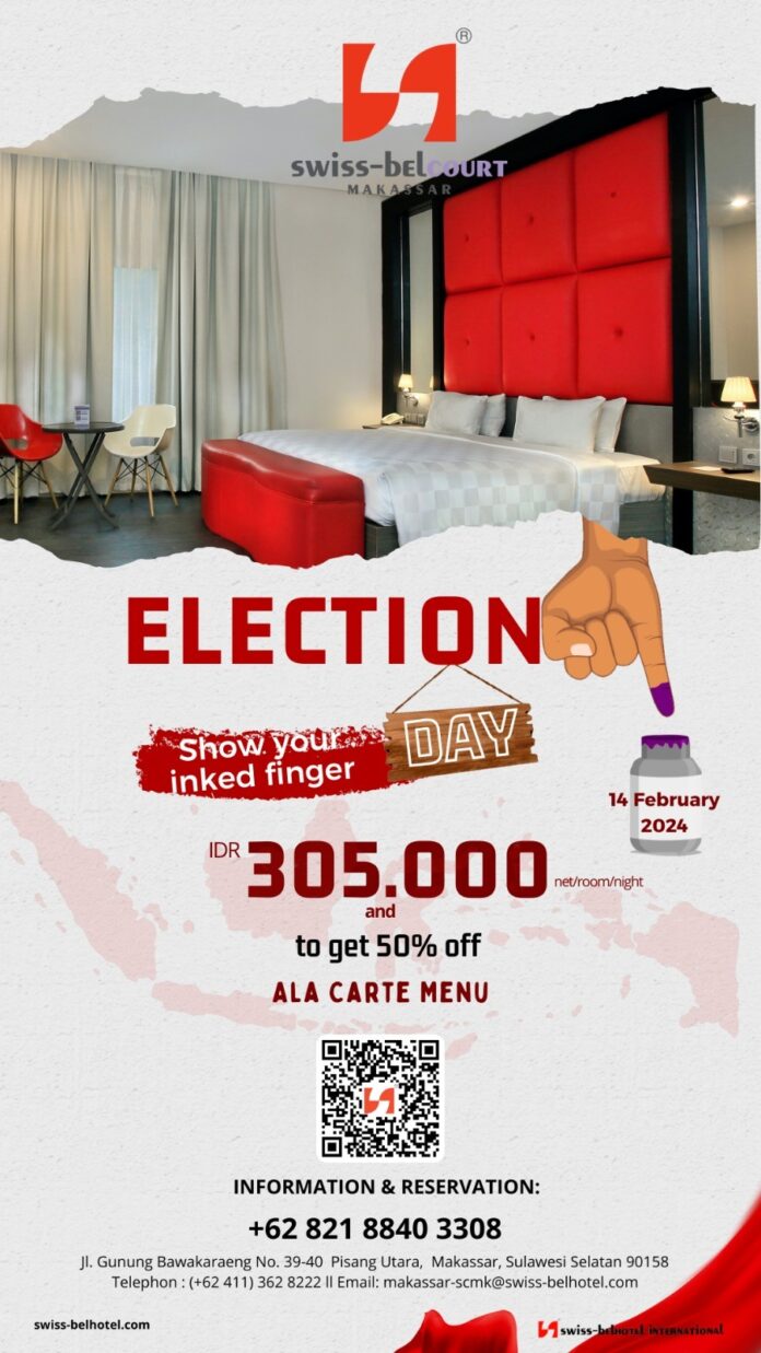 Ajang pesta demokrasi ini makin semarak dengan dukungan khususnya dari Swiss-Belcourt Makassar yang menyediakan promo khusus di hari pemilu.