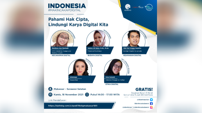 BISNISSULAWESI.COM, MAKASSAR – Rangkaian Program Literasi Digital “Indonesia Makin Cakap Digital” kembali diadakan secara virtual di Makassar, Sulawesi Selatan, dengan pembahasan tema “Pahami Hak Cipta, Lindungi Karya Digital Kita” (18/11).