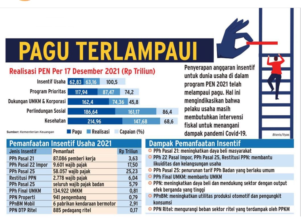 Realisasi PEN per 17 Desember 2021, sebagaimana dirilis klinik perencana keuangan melalui akun instagram @klinikperencanakeuangan, untuk insentif usaha, dari pagu sebesar Rp 62,83 triliun, sudah terealisasi 63,16 triliun atau sudah mencapai 100,5 persen.