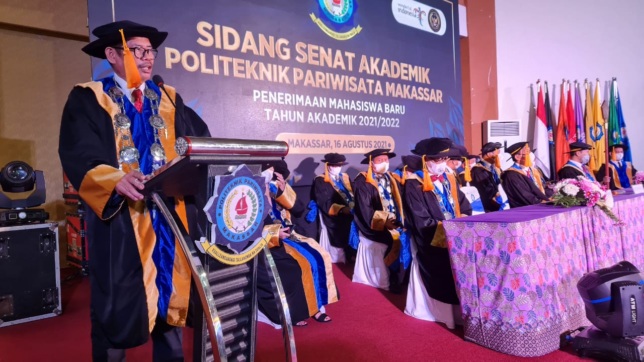 BISNISSULAWESI.COM, MAKASSAR –  Politeknik Pariwisata (Poltekpar) Makassar menggelar sidang senat terbuka, dalam rangka penerimaan mahasiswa baru tahun akademik 2021/2022, di Balairung I wayan Bendhi Kampus Poltekpar Makassar, Senin (16/8/2021).
