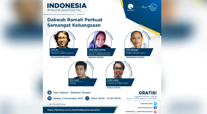 BISNISSULAWESI.COM, TOJO UNAUNA – Rangkaian Program Literasi Digital “Indonesia Makin Cakap Digital” di Sulawesi, yang diselenggarakan oleh Kementerian Komunikasi dan Informatika Republik Indonesia dan Siberkreasi bersama Dyandra Promosindo, dilaksanakan secara virtual pada 2 November 2021 di Tojo Unauna, Sulawesi Tengah.