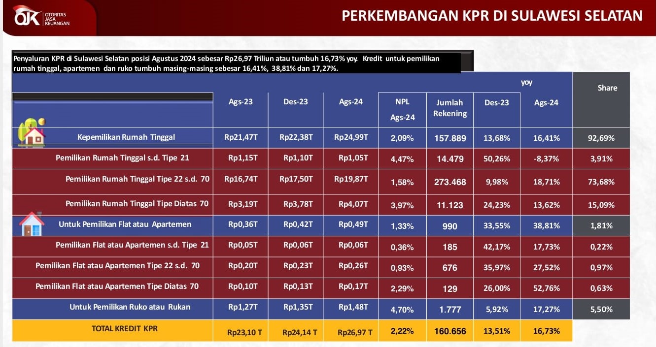 Kepala Otoritas Jasa Keuangan Sulawesi Selatan dan Sulawesi Barat (OJK Sulselbar), Darwisman menyebutkan, tingginya penyaluran kredit untuk pemilikan rumah tinggal menunjukkan besarnya minat masyarakat Sulsel untuk mewujudkan hunian idaman. Di mana, kebutuhan akan perumahan menurutnya, juga menjadi perioritas bagi Masyarakat Sulsel.